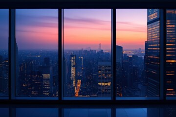 Modern urban cityscape view from highrise window reveals breathtaking dusk skyline with glowing skyscraper architecture against vibrant colorful sky providing panoramic business concept background