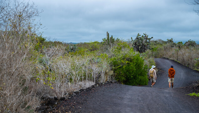 two men expolring the volcanic landscape of the Galapagos Islands