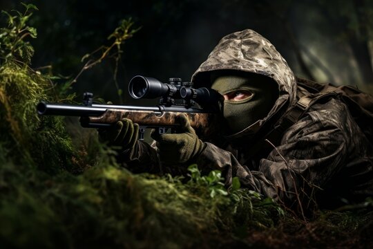 Man wearing camouflage and aiming with hunting rifle in forest. Outdoor ammo game hunter. Generate Ai