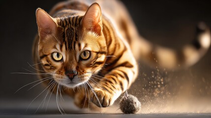 A bengal cat in action, pursuing a toy.