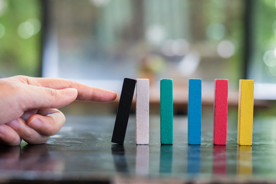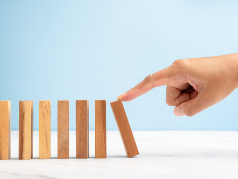 Risk and strategy in business, woman hand gambling starting push wooden block on a line of domino Concept