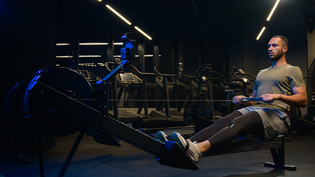 Powerful heavy weight machine sportive equipment workout in sport gym sports club strong athletic African American man athlete sportsman doing push down sitting horizontal pull block back exercise