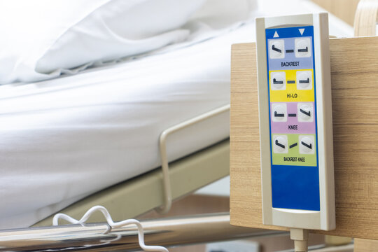 Elderly asian Woman patient hand using remote control for adjust level bed in hospital room. Happy Senior illness resting on comfortable electric bed in modern hospital