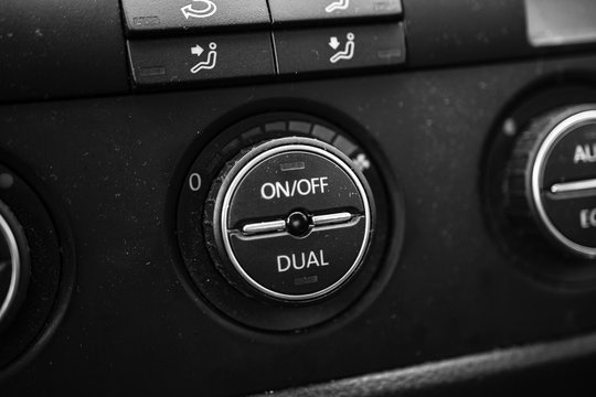 Close up photo inside a car, air conditioning buttons on and off.