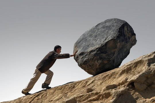 Teamwork example with business people pushing stone to top