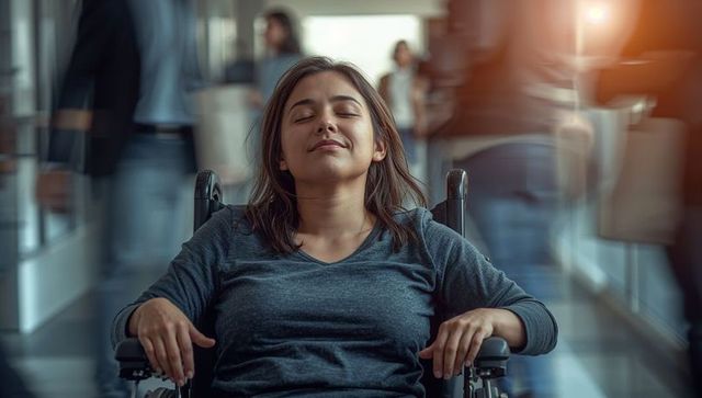 Serene woman reclining in wheelchair with closed eyes in white knit tank minimal portrait