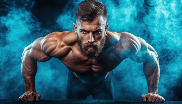 Focused Athlete: A powerful black athlete is captured mid-push-up, sweat glistening under a gradient of red and blue lights, epitomizing determination and peak physical condition.