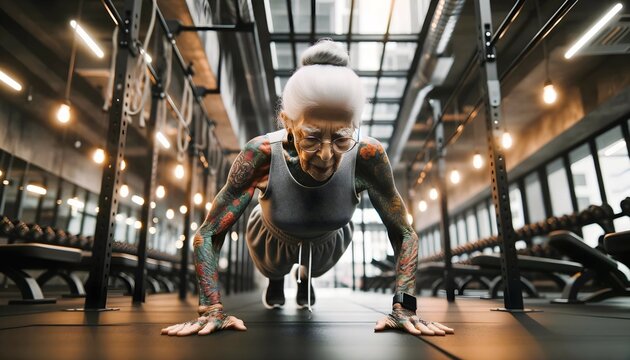 Portrait of elderly grey tattooed woman doing push ups in the  gym, active seniors background, healthy lifestyle concept