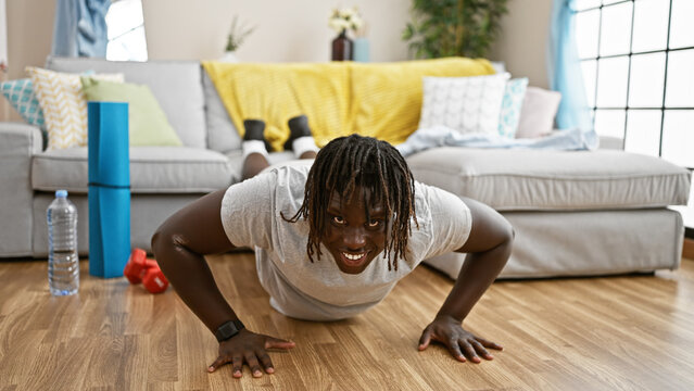 African american man training push up smiling at home