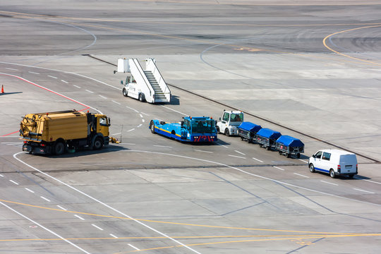 Airfield universal cleaning machine, pushback tug, passenger boarding steps vehicle, tractor with baggage carts and minivan at the airport apron