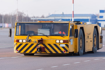 Aerodrome tow tractor is driving along the steering paths at the airport.