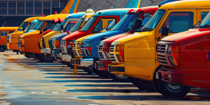 Aviation Artistry: A colorful array of airport service vehicles lined up at a hangar