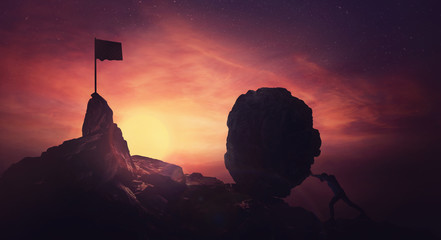 Sisyphus metaphore. Silhouette of businessman pushing heavy stone boulder up on hill.