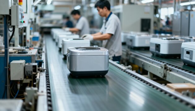 Production Line: Workers Assembling Appliances on Conveyor Belt in a Modern Manufacturing Factory Setting