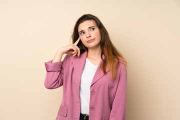 Young brunette girl with blazer over isolated background showing a sign of silence gesture putting finger in mouth