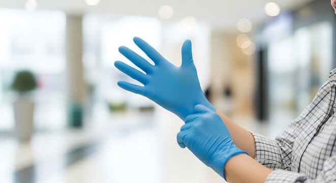 Person putting on blue disposable latex or nitrile gloves for protection and hygiene in a clean environment