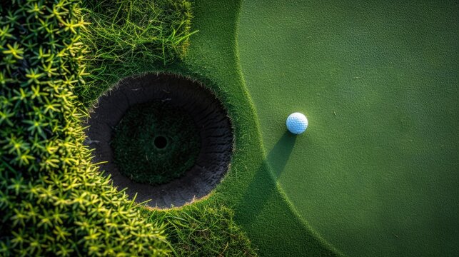 Close-up of a golf ball near the hole on a well-maintained green, illustrating precision and skill in putting