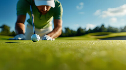 Lining up crucial putt on sunny putting green with partner holding flagstick