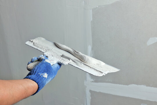 Construction worker wearing gloves and using a putty knife to plaster a white wall, performing home renovation and improvement tasks with precision