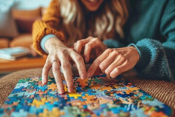 A close-up of an LGBTQ+ couple doing a puzzle together at home. The image captures their hands placing pieces, reflecting patience and cooperation. The background includes a softly lit room with