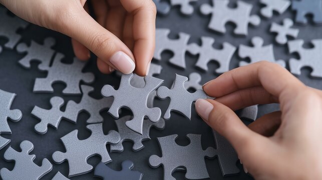 Close up hands of four businesspeople hold pieces of white puzzle, assemble jigsaw, put it together, joint path to problem solution, find way out exit of difficult situation. Support, teamwork concept