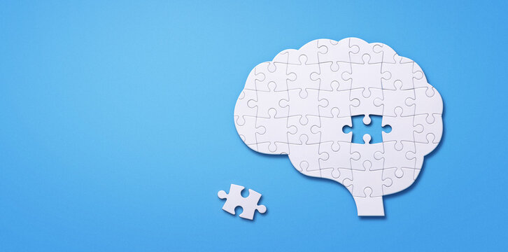 Brain shaped white jigsaw puzzle on blue background, a missing piece of the brain puzzle, mental health and problems with memory