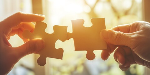 Two hands holding two pieces of a puzzle. Suitable for illustrating teamwork, problem-solving, collaboration, or completing a puzzle metaphorically