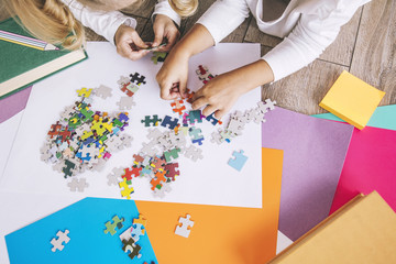 Two preschool age child put the puzzle together on the floor, hands close up