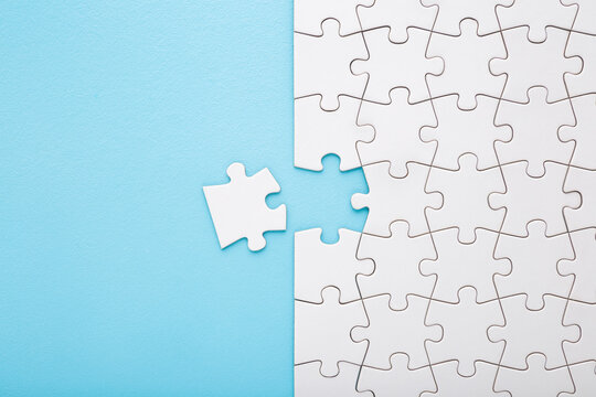 Jigsaw puzzle with missing piece on blue background