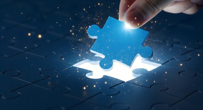 Hand placing glowing puzzle piece into missing spot, futuristic concept of solution, innovation, teamwork, and digital problem solving