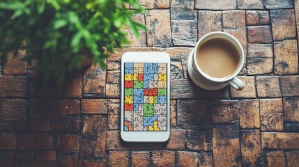 A flat lay vector of a mobile phone displaying a word puzzle game screen placed on a cafe table with a cup of coffee beside it Large space for text in center Stock Photo with copy space