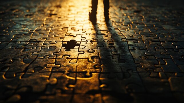 A figure attempting to solve an intricate puzzle with missing pieces, focused light casting shadows on the puzzle, detailed and complex visual style, mood of frustration and incomplete solutions