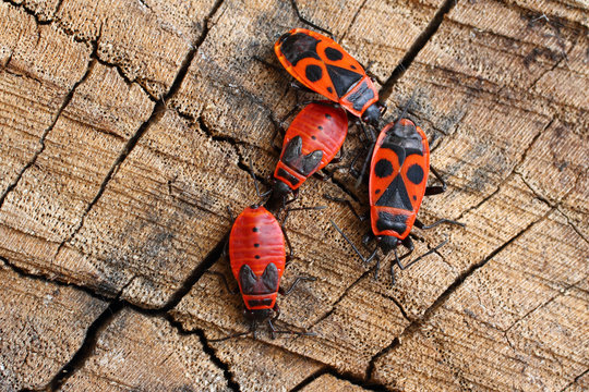 Group of red bugs on a tree. Colony of Pyrrhocoris apterus nests on the tree trunk
