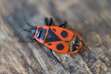 The firebug Pyrrhocoris apterus. Common insect of the family Pyrrhocoridae. Aggregation behavior of the big group of firebugs on the tree bark. Nature backgroun. Top view. Close up. Selective focus