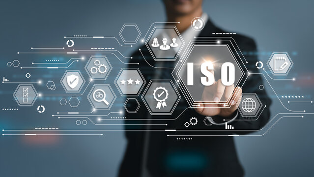 Business hand clicks ISO certification process and quality management for business and companies. for control International Standard Organization. QA, standardization for continuous improvement.