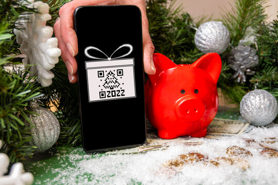 A hand holding a smartphone with a gift symbol and a QR code, a red piggy bank on gold coins covered with snow and Christmas tree