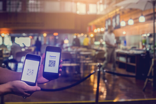 Selective focus to smart phone in hand to scan QR code on tag with blurry customer is buying food in restaurants to accepted generate digital pay without money. Qr code payment concept.