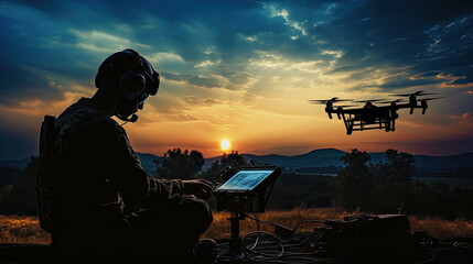 Close up picture of flaying quadrocopter dron and pilot siluette in sunset light and blue sky background, Man flying a drone in the city using a controller,