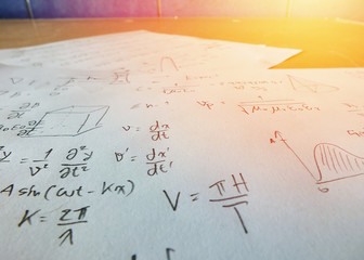 Close up mathematical equations on a sheet of paper , light effect