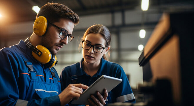Focused factory workers collaborate using a tablet for quality control in a modern industrial setting, showcasing teamwork and efficiency, appealing to manufacturing companies