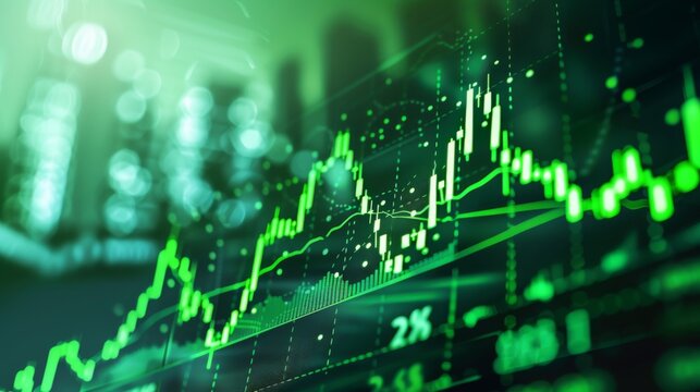 Vibrant visual representation of stock market trends featuring dynamic graphs and charts. The data reflects late trading hours, showcasing fluctuating values in real time. Generative AI
