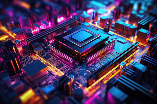 Close up of computer circuit board with Cyperpunk futuristics light background. Technology and innovation. Blue pink purple violet yellow orange colorful tone.