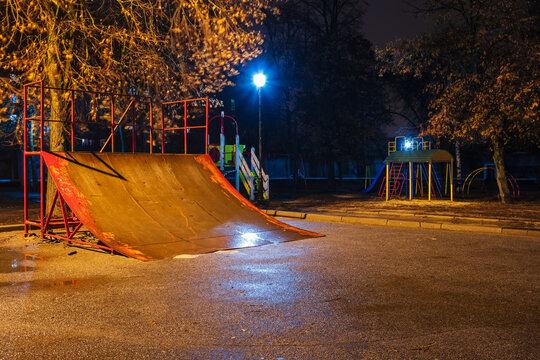 Empty skatepark with quarterpipe and playground in the light of street lamps. Evening yard in Kharkiv city, Ukraine