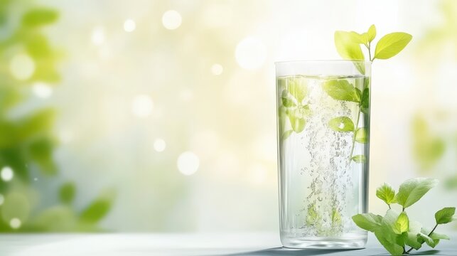 Glass of refreshing sparkling water drink with lemon and mint