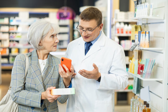 Elderly woman asks a pharmacist to help her read an electronic prescription on her smartphone screen