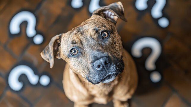 A confused dog surrounded by question marks, conveying a sense of curiosity or bewilderment.