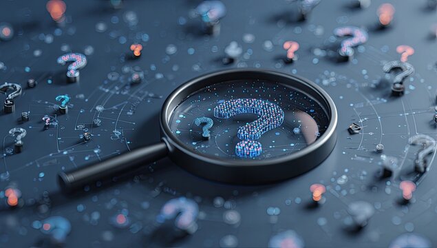 Smartphone displaying a glowing digital question mark hologram over an abstract technology background.