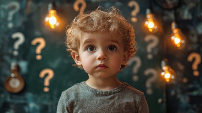 Curious child with question marks on chalkboard background, wonder and learning concept, young boy, expression, curiosity, education, illuminated lightbulbs, thoughtful child
