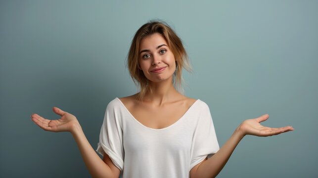 A young woman with a puzzled expression and her arms raised in a questioning gesture against a blue background.