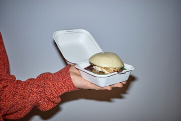 Young Asian man holding food bag and standing inside of the studio, delivery box concept.